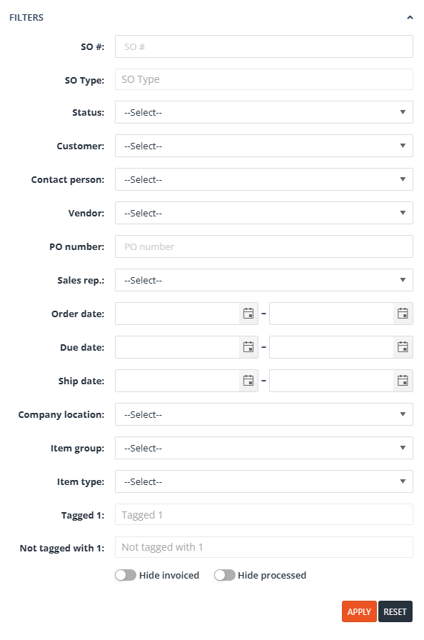 - Due Date: A range filter for specifying the start and end dates for when sales orders are due.