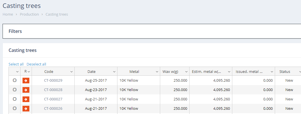 A casting tree is much like a job order: it contains certain production-related data and also includes items and services. This tool allows viewing, adding and managing CTs and also provides CT filtering options.