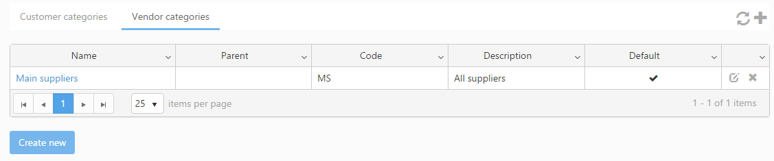 The vendor categories added to PIRO Fusion can be viewed on the Categories menu’s Vendor categories tab. Vendor categories can be added – , edited –