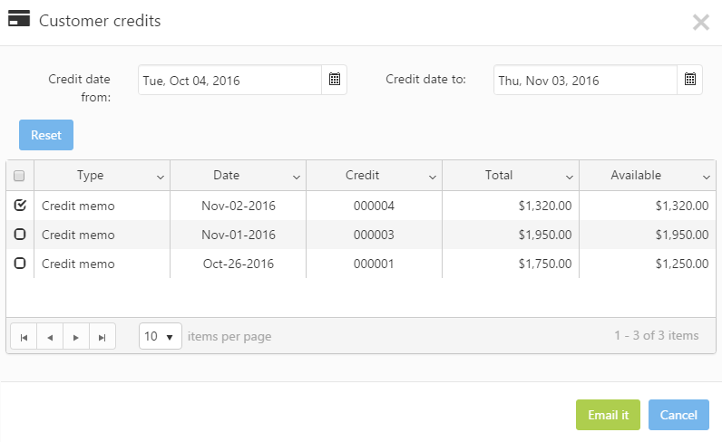 The Create date from and the Create date to filters in the upper section of the dialog can be used to list the credit memos that were created within a particular date range. The content of the filters can be cleared by clicking on the Reset button. The selected credit memos can be e-mailed by clicking on the Email it button at the bottom of the form.