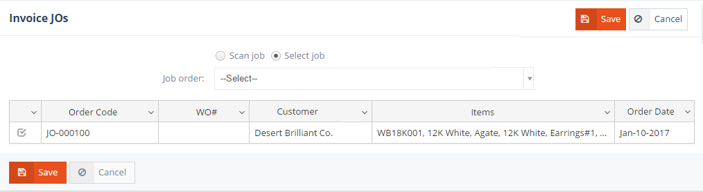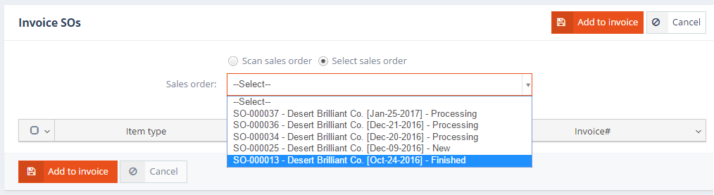Sales orders may also be invoiced. When the Job order associated with a Sales order has been completed (the JO’s status is Closed), the sales order’s status can be set to Finished. Sales orders in Finished status can then be added to invoices using the Add sales order button.