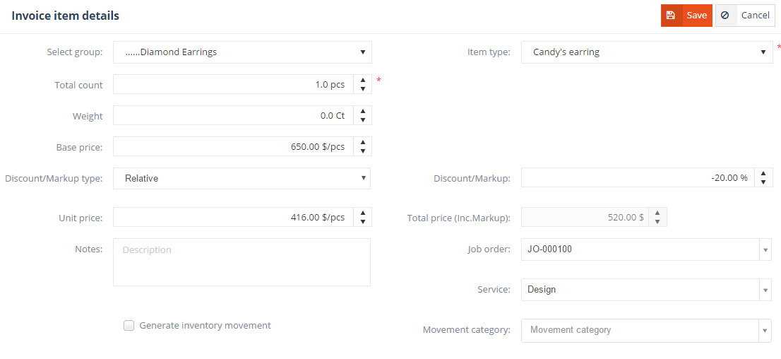Item notes can be added in the Description field. A separately added invoice item can either be set to show as part of a job order, or as a separate item altogether. If you want to attach the item type to a job order, select a job order from Job order dropdown, the list will contain the invoice’s job order codes. The Service field sets the parent service of the newly added item type. If no service is specified, the item is inserted immediately bellow the job order’s last item. An inventory movement can also be generated for the item’s quantity by checking the Generate inventory movement setting.