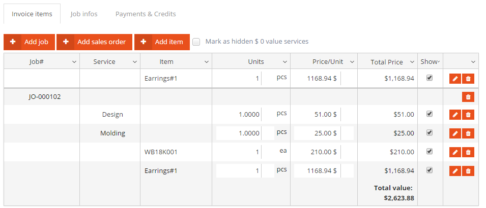 Job order and sales order items (services, item types) are automatically added as invoice items when invoicing the JO/SO. Individual invoice items can also be added using the Add item button.