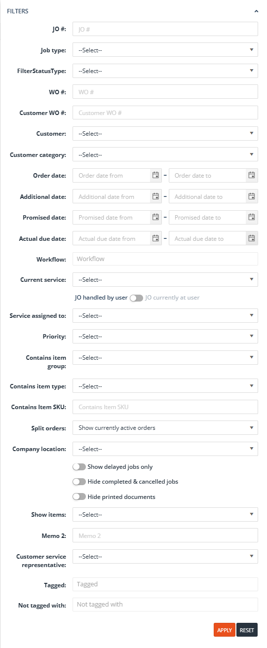 Click the Filters button at the top-left to open advanced filtering options. You can filter job orders using one or more of the following fields: