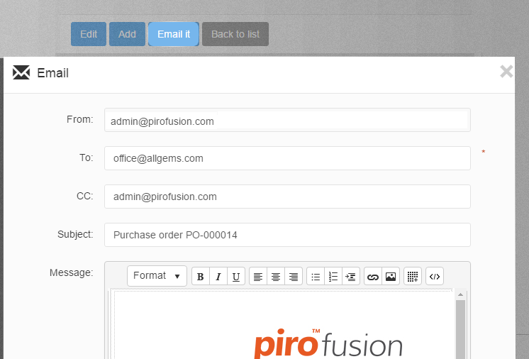 - The Email it button is available from the PO details form (in view mode) and allows sending email to the PO vendor. By clicking this button you can send an email to the vendor including the purchase order.
