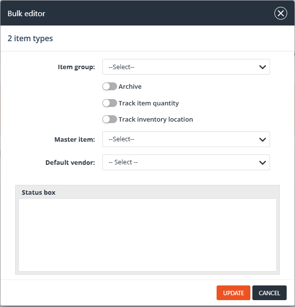 - Item Group: Allows users to change the item group of the selected item types. Note: Changing the item group may affect several settings, such as measurement units, attribute lists, and default attributes on the updated item types.